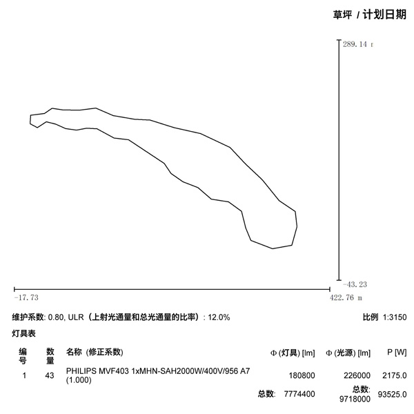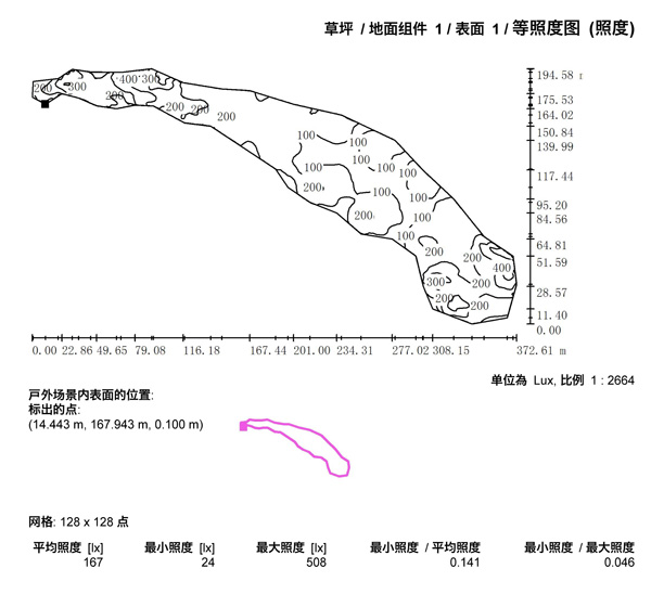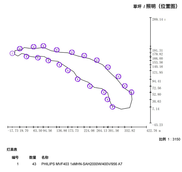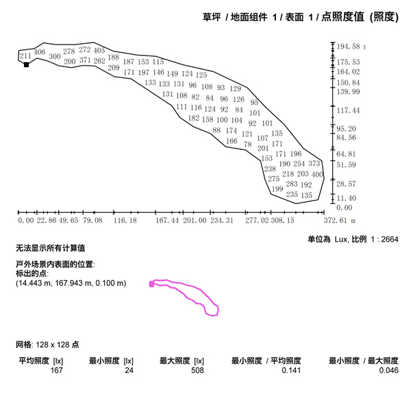 在所有體育相關(guān)的照明標(biāo)準(zhǔn)中,只有IESNA RP-6-01《體育運動照明標(biāo)準(zhǔn)》中明確提出了對高爾夫球場的水平照度要求。下面介紹本案高爾夫球場照度計算。