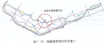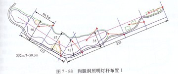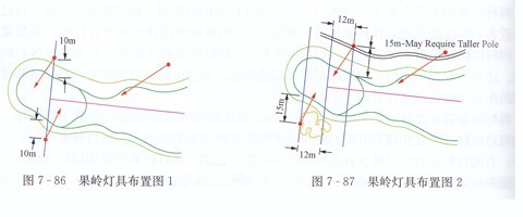 狗腿洞的照明設(shè)計(jì)。(見圖7-88)所示,通過前面所述的方法決定球道上燈桿的布置,沿狗腿洞外緣畫線以決定球道長度,用球道長度和寬度決定燈桿數(shù)量和間距。