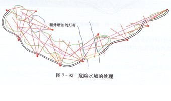 在球道中間的水域應(yīng)當(dāng)與球道一樣對待,提供同樣的照明,因?yàn)榍蛲瑯颖仨毚┻^水面,同樣需要垂直照明度,不要試圖改變設(shè)計(jì)原則。(見圖7-93)