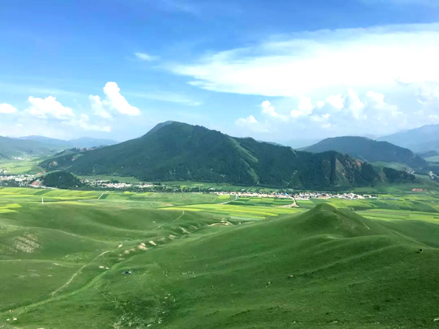 在7、8月份,高山牧場的野花把草原點綴得五彩繽紛,如綢似錦;數(shù)不盡的牛羊膘肥體壯,若隱若現(xiàn);成片的油菜花在湖邊肆意開放,藍天白云映襯下的金黃、嫩綠,打造出一片絕美的曠世風(fēng)景。