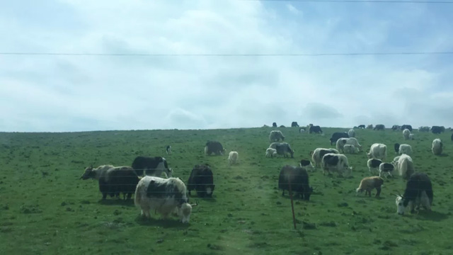 看慣了家鄉(xiāng)的山山水水,這樣毫不掩飾地坦露的自然美景、展示著大自然的本來面目,無意間給人一種震憾,一種真實,一種坦蕩;草地上大群的白色山羊和黑色的牦牛低著頭吃草,在這驕陽似火的七月,站在海拔3520米的日月山山口,凜冽的寒風(fēng)急掠而過,竟然令人瑟瑟發(fā)抖。下車,在頂峰日月山碑旁大家拍照留念,心曠神怡。