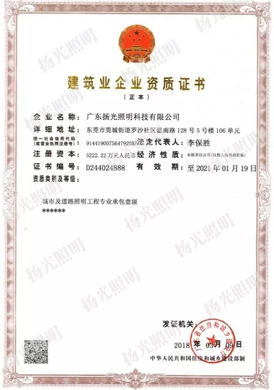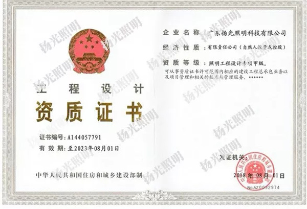 近日,揚(yáng)光照明成功取得了由國(guó)家住房與城鄉(xiāng)建設(shè)部頒發(fā)照明工程設(shè)計(jì)專項(xiàng)資質(zhì)甲級(jí),至此,公司已成為全國(guó)為數(shù)不多的城市及道路照明工程施工壹級(jí),照明工程設(shè)計(jì)專項(xiàng)資質(zhì)甲級(jí)的“雙甲”企業(yè),“雙甲”資質(zhì)的取得體現(xiàn)了行業(yè)和市場(chǎng)對(duì)公司綜合實(shí)力的高度認(rèn)可,意味著可以承接任何規(guī)模的