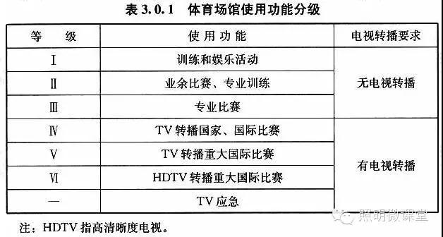 為體育場(chǎng)館做照明設(shè)計(jì),我們首先要搞清楚的是照明級(jí)別。國(guó)標(biāo)對(duì)體育場(chǎng)館分級(jí)如下: