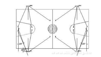 2.采用場地兩側(cè)布燈方式,燈具不宜布置在球框中心沿底線20度的范圍內(nèi),燈桿底部與場地邊線之間的距離不應(yīng)小于1米,燈具高度宜滿足燈具到場地中心線的垂直連線,與場地平面之間的夾角不宜小于25度。