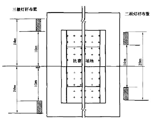 2)場(chǎng)地兩側(cè)應(yīng)采用對(duì)稱的燈具布置方式,提供相同的照明。