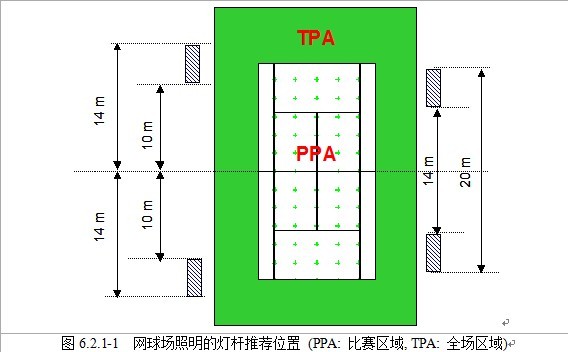 用一正式比賽的單個網(wǎng)球場地,燈桿安裝高度至少為12m。(見圖7-29)