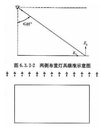 (2).兩側(cè)布燈宜選用非對稱型配光燈具,布置在馬道上,適用于垂直照度要求較高以及有電視轉(zhuǎn)播要求的體育館。兩側(cè)布燈時,燈具瞄準角不應大于65度。圖6.3.2-3,
