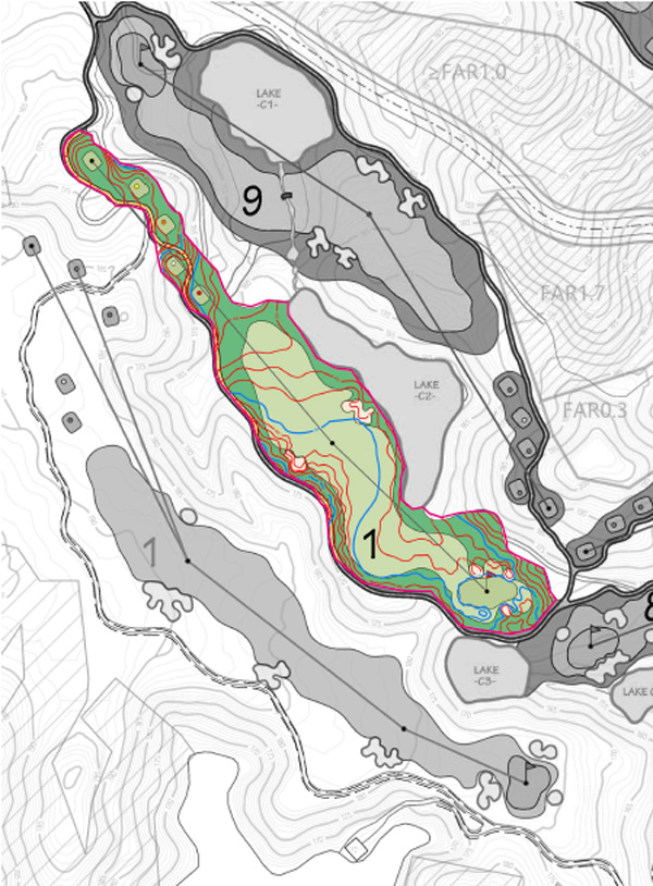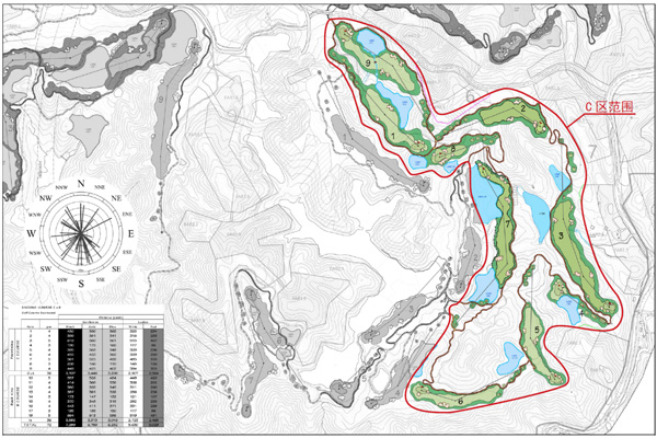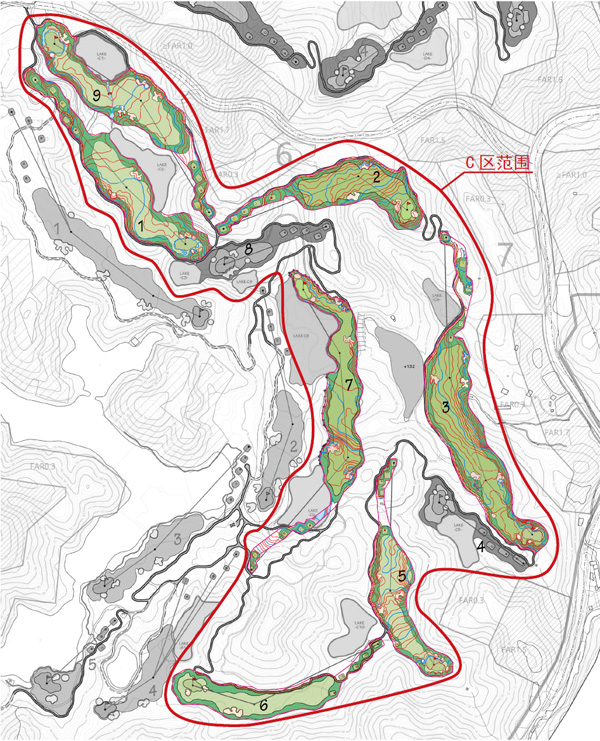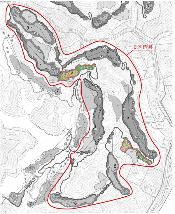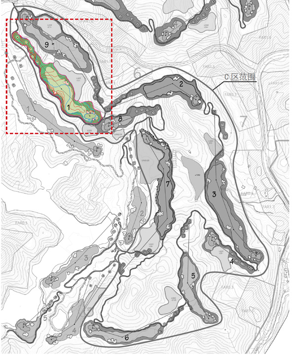 星河山海半島高爾夫球場(chǎng)共分為A、B、C 三個(gè)場(chǎng),本次設(shè)計(jì)燈光設(shè)計(jì)范圍為C 區(qū)(如下圖紅色標(biāo)線(xiàn)區(qū)域)。C 區(qū)共分為9 個(gè)球洞,每個(gè)球洞都充分利用現(xiàn)有地形條件,與自然地貌融合一體,形成獨(dú)具特色的球洞設(shè)計(jì)。其夜景燈光照明需根據(jù)每個(gè)球洞不同的地形條件,進(jìn)行相對(duì)應(yīng)的優(yōu)質(zhì)燈光照明設(shè)計(jì)方案。