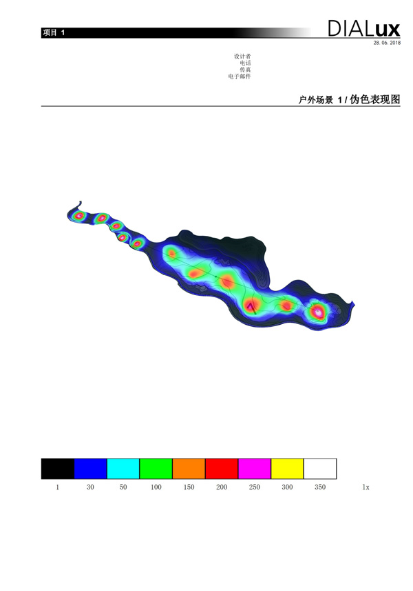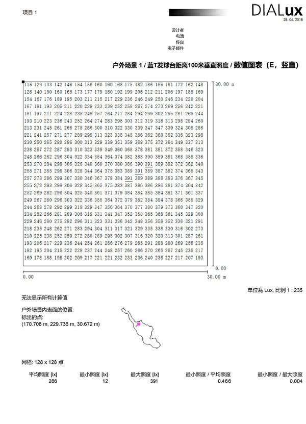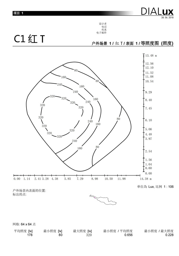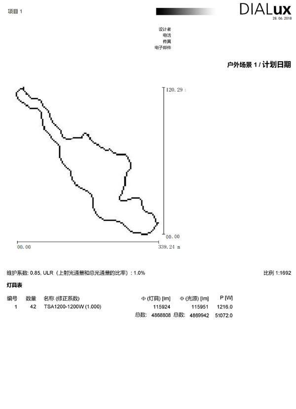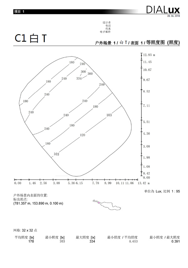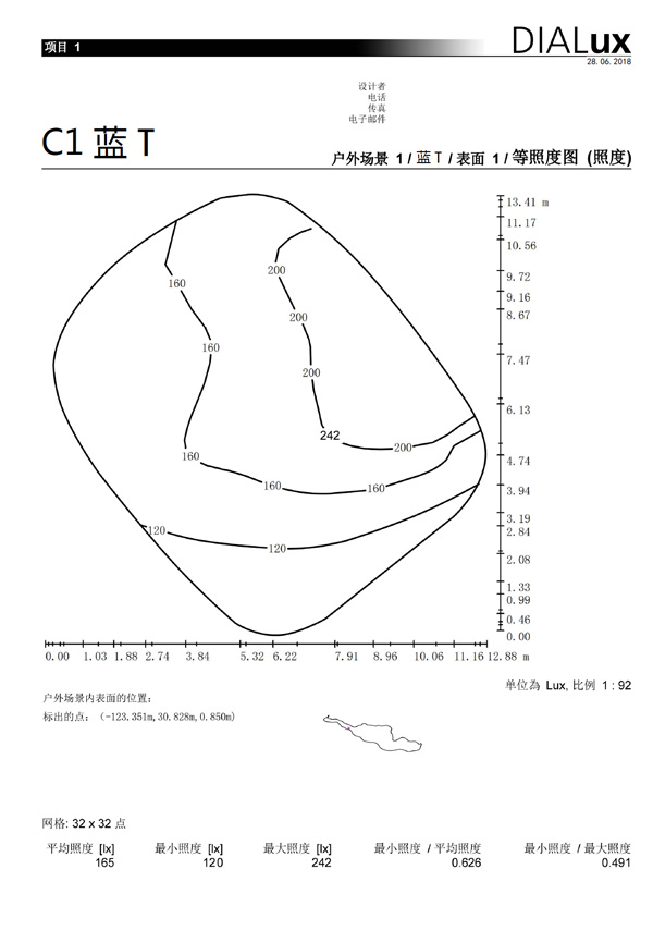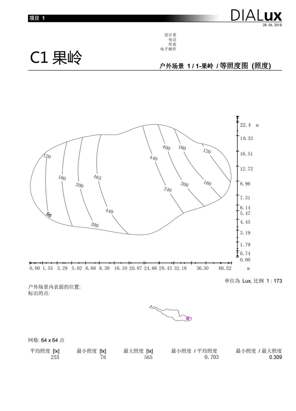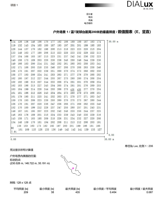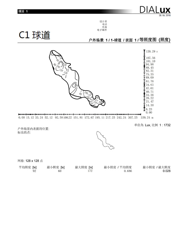 其中球道半徑超過(guò)60 米的超寬球洞有7 個(gè),分別為C1、C2、C3、C5、C6、C7、C9 號(hào)球洞。根據(jù)高爾夫球場(chǎng)燈光設(shè)計(jì)原則,此類(lèi)型球場(chǎng)采用18 米高燈桿,球道燈具布置采用雙邊對(duì)稱(chēng)式布燈,從球道兩側(cè)同時(shí)提供照明, 以達(dá)到照度標(biāo)準(zhǔn)技術(shù)要求。