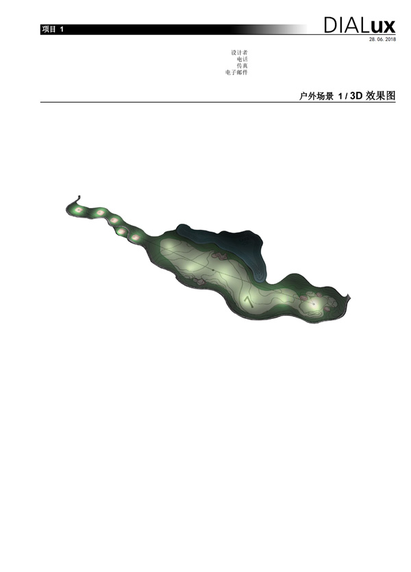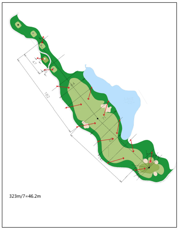 C4、C8 號(hào)球洞的寬度在60 米以下,根據(jù)高爾夫球場(chǎng)燈光設(shè)計(jì)原則,此類(lèi)型球場(chǎng)采用15 米高燈桿,球道燈具布置采用雙邊交錯(cuò)布燈的方式,根據(jù)每個(gè)球洞的具體地形,進(jìn)行燈具燈桿的布置。