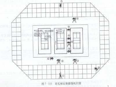 大型羽毛球比賽電視轉(zhuǎn)播的機(jī)位圖如圖:7-111所示,該圖與表7-55配合使用。